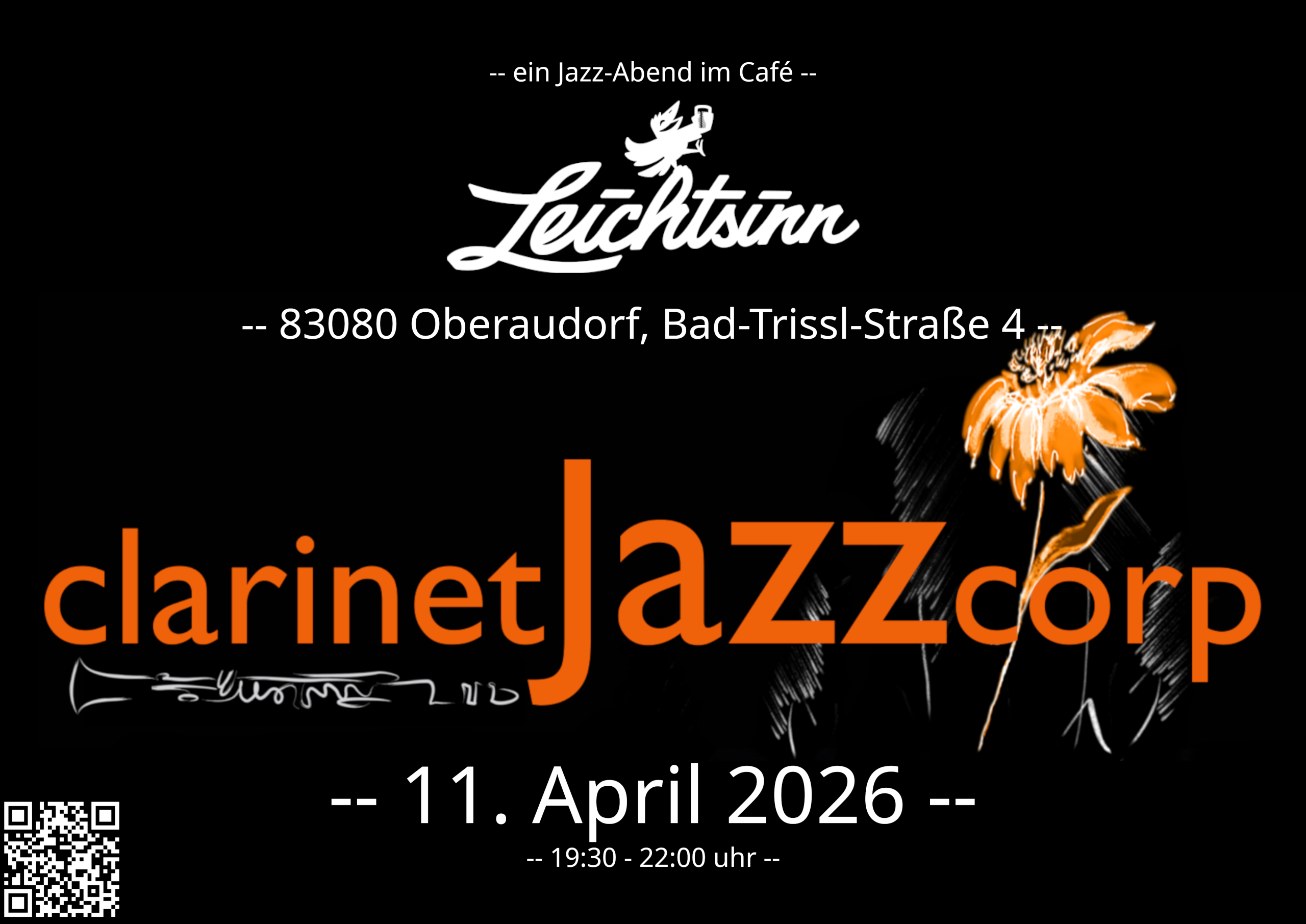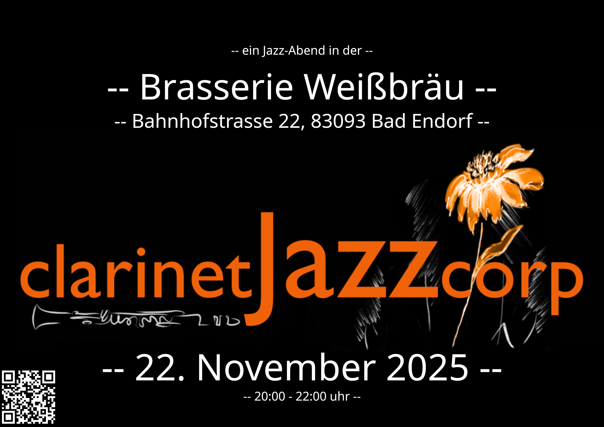 Am Samstag, dem 22. November 2025 spielt clarinetJAZZcorp abends von 20 bis 22 Uhr in der Brasserie Weißbbräu in Bad Endorf. Beseeltes Jazz-Konzert in freundlichem Ambiente.