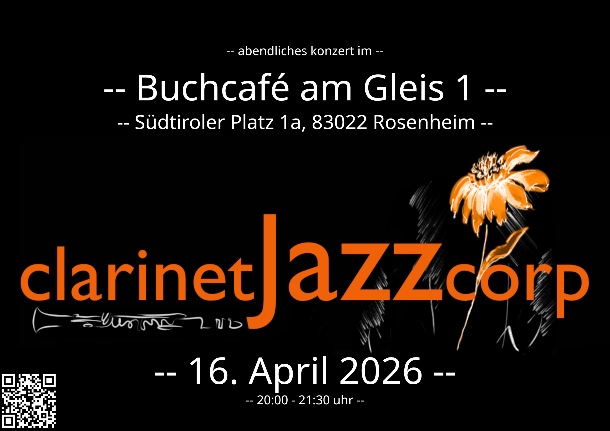 Am Donnerstag, den 16. April 2026, spielt clarinetJAZZcorp um 20 Uhr im Buchcafé in Rosenheim. In dem am Bahnhof gelegenen netten Café von der Caritas finden regelmäßig Konzerte in gemütlichem Ambiente statt. Der Eintritt ist frei, um Spenden wird gebeten.